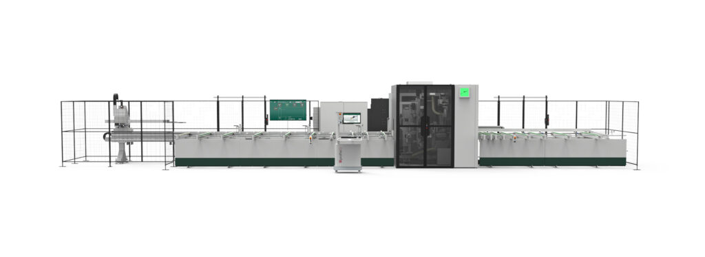Il magazzino di scarico è dotato di sistema motorizzato per l’estrazione rapida dei pezzi finiti e il loro trasferimento verso l’operatore. La linea è gestita tramite console di comando con PC industriale e software dedicato che consente la gestione delle liste di lavoro, l’ottimizzazione dei tagli, la simulazione grafica delle lavorazioni e l’integrazione con sistemi CAD/CAM tramite file XML e DXF.